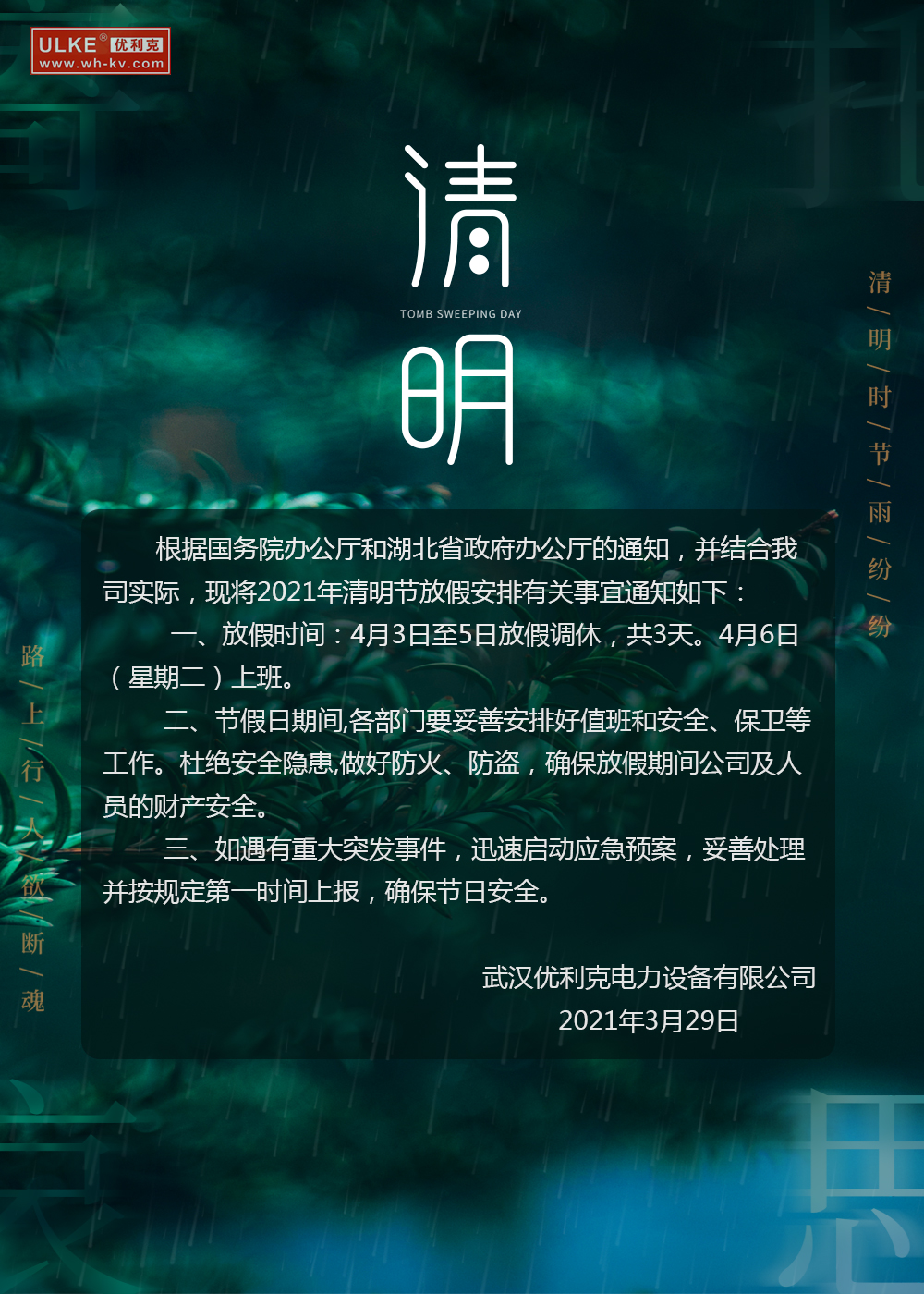 根據國務院辦公廳通知以及結合公司實際情況,公司現將2021年清明節放假安排通知如下: