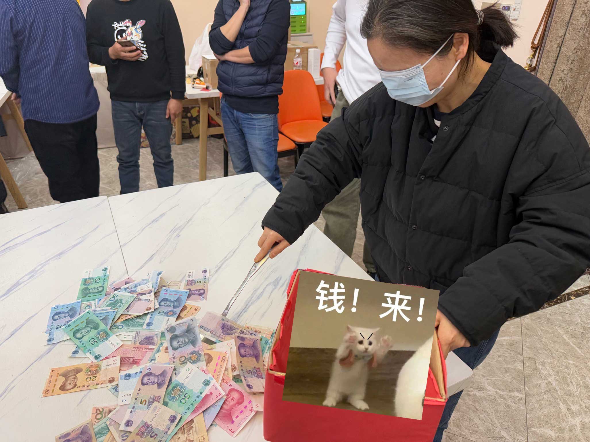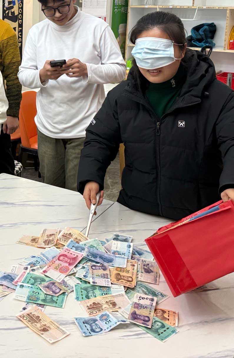 蒙眼鏟錢游戲更是將現(xiàn)場的歡樂氛圍推向了極致。蒙上雙眼的同事們在劃定區(qū)域內(nèi)小心翼翼地摸索前進(jìn),努力鏟起象征著好運(yùn)的