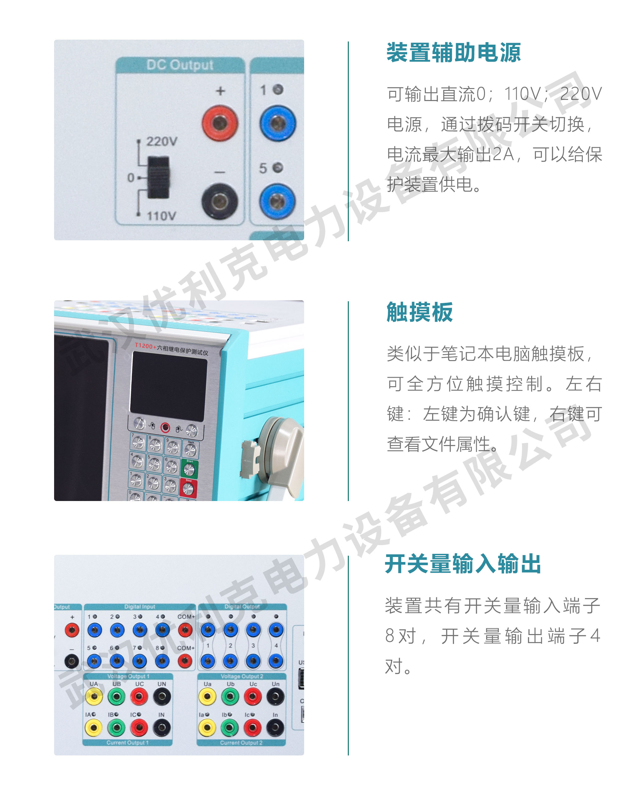 11.配有獨立專用直流輔助電壓源輸出,輸出電壓分別為110V(1A),220V(0.6A)。以提供給需要直流工作電源的繼電器或保護裝置使用。
