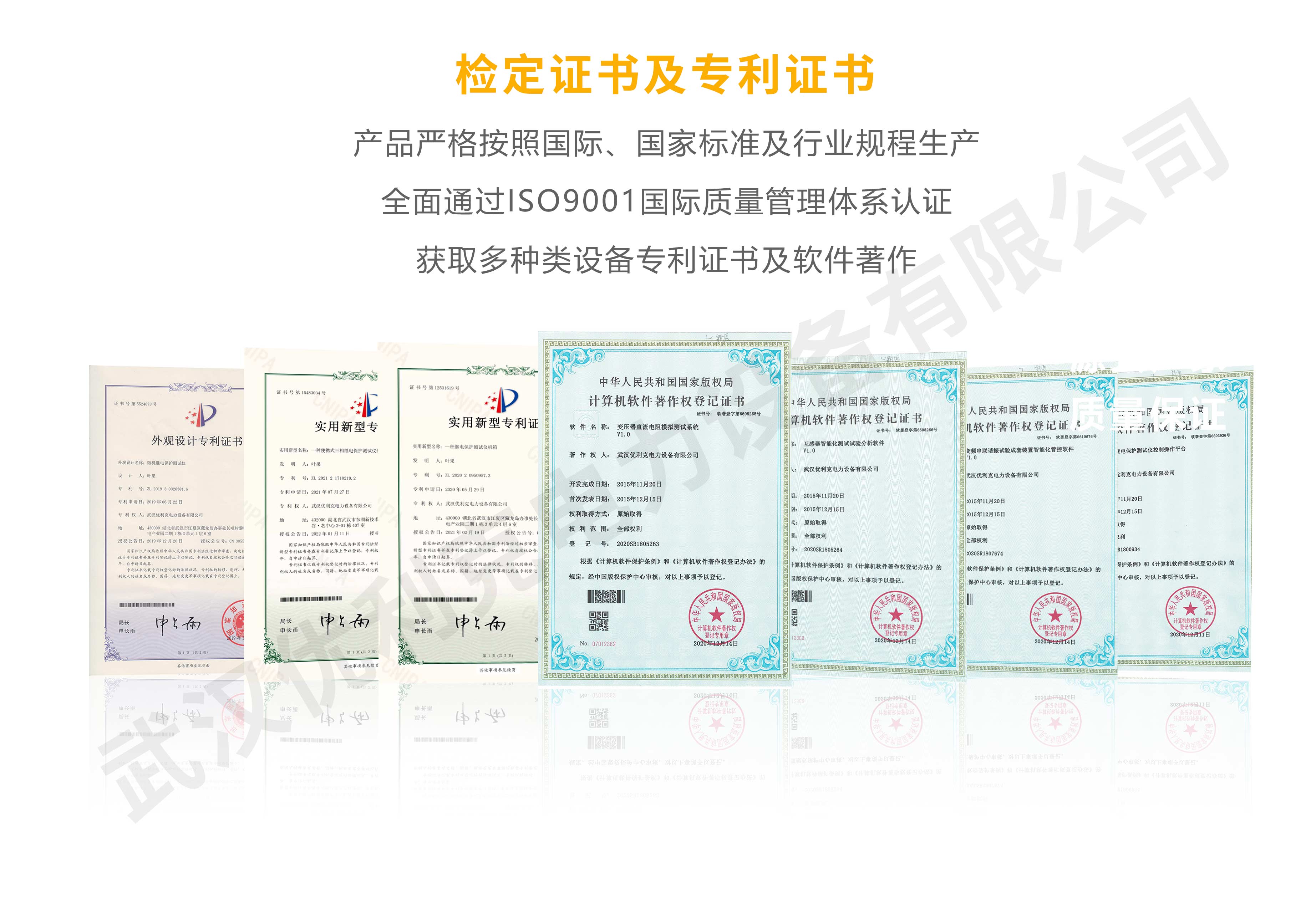 企業產品嚴格按照國際、國家標準及行業規程生產,通過國家、各省級、市級電力研究所、計量中心及電力權威部門的檢測,全面通過ISO9001國際質量管理體系認證、中華人民共和國制造計量器具許可證、GB/T19001-2016質量管理體系要求、GB/T24001-2016環境管理體系要求、GB/T45001-2020職業健康安全管理體系要求。