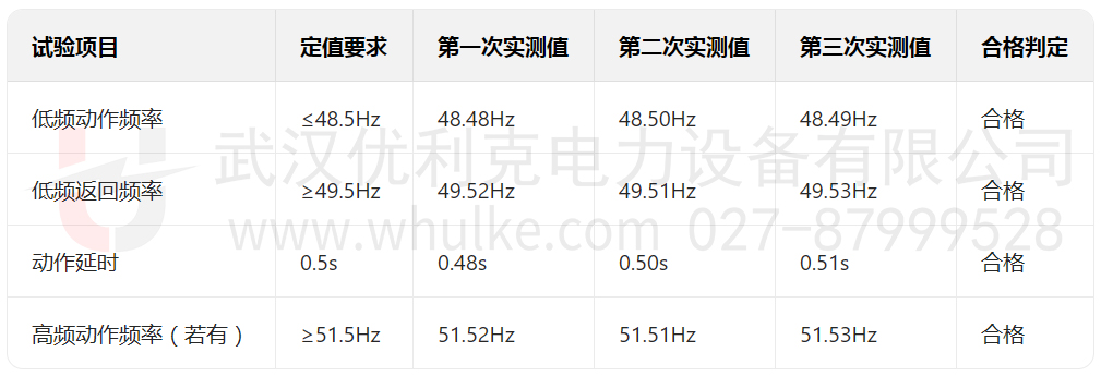 判定返回系數:返回系數 = 返回頻率 / 動作頻率,通常要求返回系數≥0.95(或按裝置說明書要求),確保保護裝置在頻率恢復時能